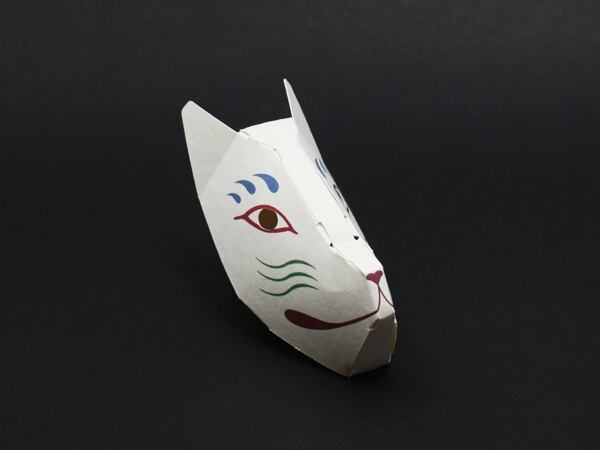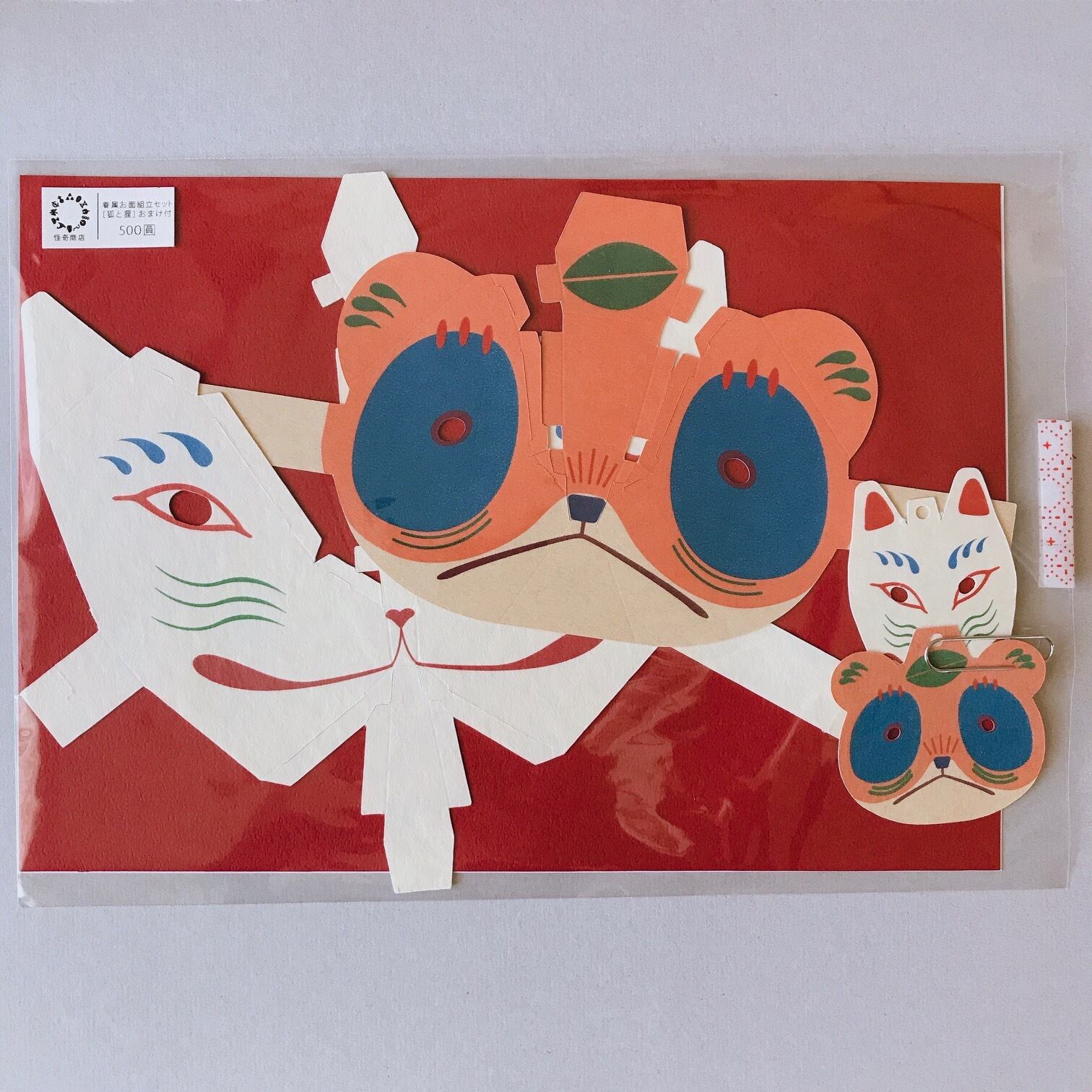 狐、狸のお面を各1枚と、小さなメッセージカードにもなるミニお面も各柄1枚ずつ付いています。
